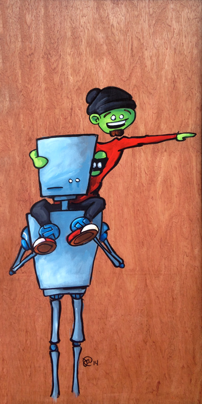 The idea stuck with me about a kid and his robot pal having goofy adventures together, until one fateful day when the robot's battery runs dry and the two are eternally inseparable. Friends forever!